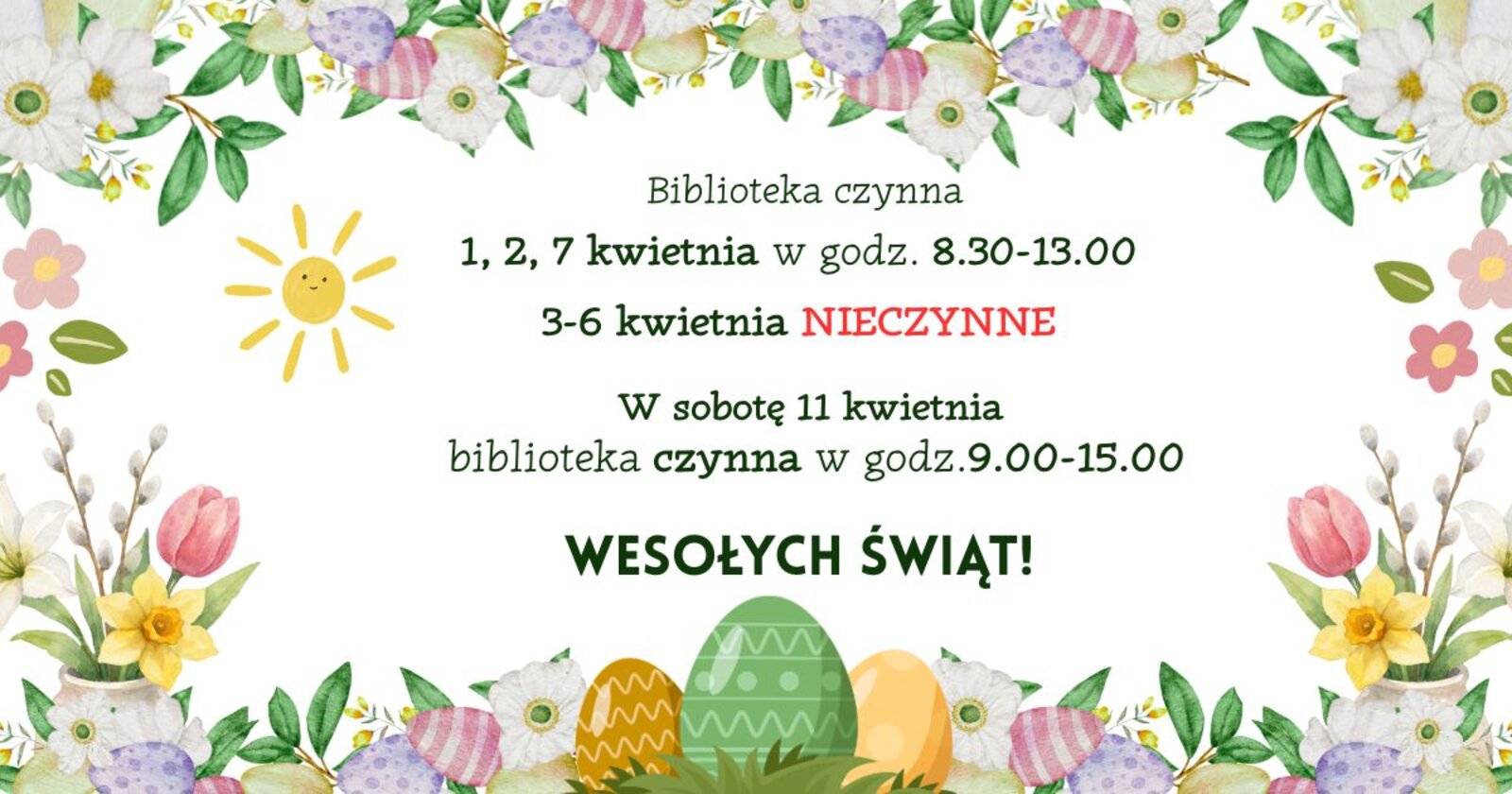 w dniach 1,2 i 7 kwietnia biblioteka czynna w godz. 8.30-13.00.